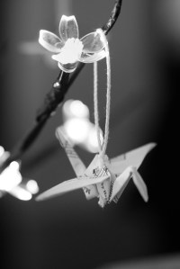 These flash phone photos are not great due to the poor lighting in the room. In person, the cranes appear to float delicately in an appealing pillar that invites the eye and catches the light well. I wanted to share this display idea for any one else who might need a little inspiration, especially since I haven’t seen anything else like it online. If you’ve folded one thousand origami cranes and come up with a unique way to display your senbazuru, I would love to hear about it!